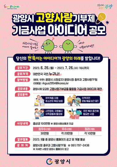 [¹Ìµð¾îÀü³² ÀÓ¼º¿Ï ±âÀÚ]±¤¾ç½Ã´Â °íÇâ»ç¶û±âºÎÁ¦ ½ÃÇàÀ¸·Î ¸ð±ÝµÈ ±âºÎ±ÝÀ» Ȱ¿ëÇÏ¿© ±âºÎÀÚ°¡ °ø°¨Çϰí Áö¿ªÁÖ¹ÎÀÌ Ã¼°¨ÇÏ´Â ±â±Ý»ç¾÷À» ¹ß±¼Çϱâ À§ÇØ 6¿ù 26ÀϺÎÅÍ 7¿ù 26ÀϱîÁö °íÇâ»ç¶û±âºÎÁ¦ ±â±Ý»ç¾÷ ¾ÆÀ̵ð¾î °ø¸ðÀüÀ» ÁøÇàÇÑ´Ù¡¦