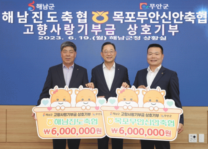 [¹Ìµð¾îÀü³² Á¦°¥´ëÁ¾ ±âÀÚ]ÇØ³²ÁøµµÃàÇù°ú ¸ñÆ÷¹«¾È½Å¾ÈÃàÇùÀº °íÇâ»ç¶û±âºÎÁ¦ Ȱ¼ºÈ¸¦ À§ÇØ °¢ Á¶ÇÕ ÀÓÁ÷¿ø 50¸íÀÌ ½Ê½ÃÀÏ¹Ý ¸ðÀº °íÇâ»ç¶û±âºÎ±Ý 600¸¸¿ø¾¿À» »óÈ£Áö¿ª¿¡ ±âºÎÇß´Ù. 19ÀÏ ÇØ³²±ºÃ» »óȲ½Ç¿¡¼ ÁøÇàµÈ ±âºÎ½ÄÀº ¸íÇö°ü¡¦