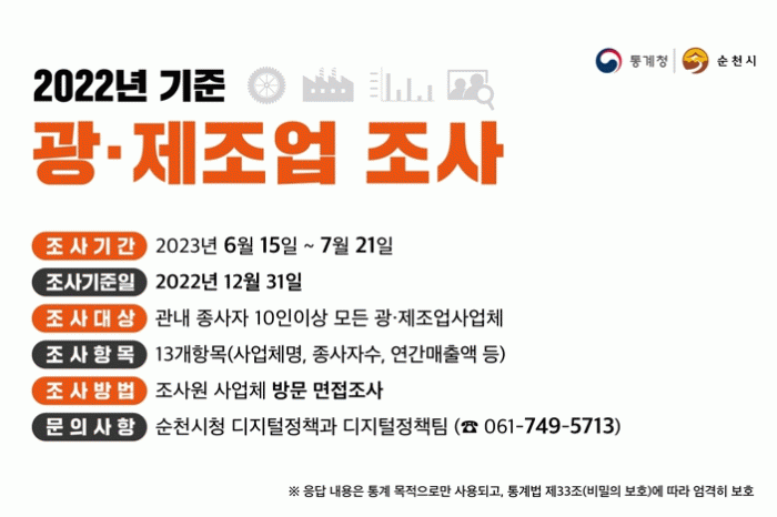 [¹Ìµð¾îÀü³² ÀÓ¼º¿Ï ±âÀÚ]¼øÃµ½Ã´Â ¿À´Â 15ÀϺÎÅÍ 7¿ù 21ÀϱîÁö °ü³»ÀÇ ±¤¾÷¡¤Á¦Á¶¾÷ »ç¾÷ü¸¦ ´ë»óÀ¸·Î 2022³â ±âÁØ ±¤¾÷¡¤Á¦Á¶¾÷ Á¶»ç¸¦ ½Ç½ÃÇÑ´Ù°í ¹àÇû´Ù. À̹ø Á¶»ç´Â ¸Å³â Àü±¹ÀûÀ¸·Î ½Ç½ÃÇÏ´Â ±¹°¡Åë°èÁ¶»ç·Î, 2022³â 12¿ù 31ÀÏ ¡¦