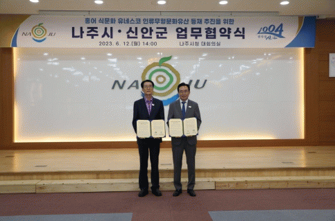 [¹Ìµð¾îÀü³² °í±Ô¼® ±âÀÚ]½Å¾È±ºÀº 6¿ù 12ÀÏ ³ªÁÖ½Ã¿Í ¡®È«¾î½Ä¹®È À¯³×½ºÄÚ Àηù¹«ÇüÀ¯»ê µîÀç °øµ¿ ÃßÁøÀ» À§ÇÑ ¾÷¹«Çù¾à¡¯À» ü°áÇß´Ù. ³ªÁÖ½Ãû ´ëȸÀǽǿ¡¼ ÁøÇàµÈ Çù¾à½Ä¿¡´Â ½Å¾È±ºÀÇȸ, ³ªÁÖ½ÃÀÇȸ, Èæ»êµµ ¹× ¿µ»êÆ÷ Áֹεé±î¡¦