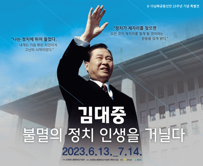 [¹Ìµð¾îÀü³² °í±Ô¼® ±âÀÚ]±è´ëÁ߳뺧ÆòÈ»ó±â³ä°üÀÌ ±è´ëÁß Àü ´ëÅë·ÉÀÇ Á¤Ä¡ ÀÔ¹® °úÁ¤°ú ±× ÀÏ´ë±â¸¦ ´ãÀº »çÁøÀüÀ» ¿¬´Ù. 6.15 ³²ºÏÁ¤»óȸ´ã 23ÁÖ³âÀ» ±â³äÇÏ´Â À̹ø Àü½Ã´Â ¡®±è´ëÁß ºÒ¸êÀÇ Á¤Ä¡ ÀλýÀ» °Å´Ò´Ù¡¯´Â ÁÖÁ¦·Î ¿À´Â 13¡¦