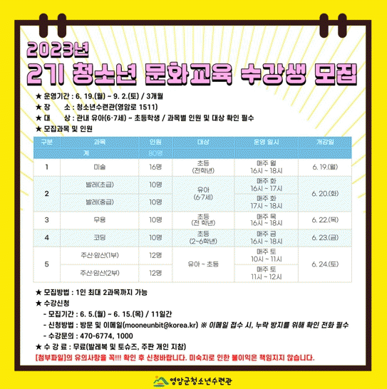 [¹Ìµð¾îÀü³² Á¦°¥´ëÁ¾ ±âÀÚ]Àü³² ¿µ¾Ï±ºÀÌ ¹ÌÃëÇÐ ¾Æµ¿ºÎÅÍ Ã»¼Ò³â±îÁö ´Ù¾çÇÑ ¿¬·É´ë¿¡ ¸ÂÃãÇü ÇÁ·Î±×·¥À» Á¦°øÇϱâ À§ÇØ 2±â û¼Ò³â ¹®È±³À° ¼ö°»ýÀ» ¸ðÁýÇÑ´Ù. 6¿ùºÎÅÍ 9¿ù ÃʱîÁö 3°³¿ù °úÁ¤À¸·Î ¿î¿µµÇ´Â ¹®È±³À°Àº, âÀǼº¡¤°¨¡¦