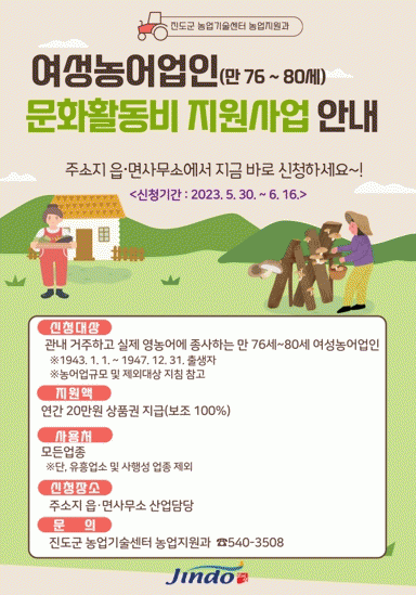 [¹Ìµð¾îÀü³² Á¦°¥´ëÁ¾ ±âÀÚ]Áøµµ±ºÀÌ ¿©¼º ³ó¾î¾÷Àε鿡°Ô ¹®ÈȰµ¿ºñ·Î 1Àδç 20¸¸¿øÀ» Áö¿øÇÑ´Ù°í Áö³ 7ÀÏ ¹àÇû´Ù. ¹®ÈȰµ¿ºñ Áö¿øÀº ¹®ÈÀû ¿©°ÇÀÌ ¿¾ÇÇÑ ³ó¾îÃÌ Áö¿ª ¸¸ 20¼¼ÀÌ»ó ºÎÅÍ 75¼¼ ¿©¼º ³ó¾î¾÷Àε鿡°Ô ¹®È ÇâÀ¯ ±âȸ¸¦¡¦