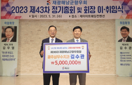 [¹Ìµð¾îÀü³² Á¦°¥´ëÁ¾ ±âÀÚ]Àç±¤ÇØ³²±ºÇâ¿ìȸ Á¦36´ë ȸÀå¿¡ ÃëÀÓÇÑ ±è¼ö°ü ±¤ÁÖ »ó¹«¼öÄ¡°ú ¿øÀåÀÌ ÇØ³²±º¿¡ °íÇâ»ç¶û±âºÎ±Ý 500¸¸¿øÀ» ±âŹÇß´Ù. ÇØ³²À¾ Ãâ½ÅÀÎ ±è¼ö°ü ȸÀåÀº Á¶¼±´ëÇб³Ä¡°úº´¿øÀå, Á¶¼±´ëÇб³Ä¡´ëÇÐÀåÀ» ¿ªÀÓÇϰí, ¡¦