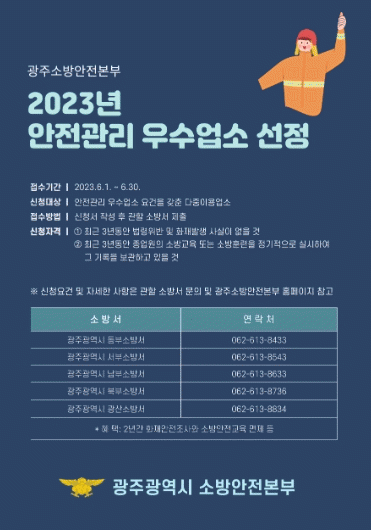 [¹Ìµð¾îÀü³² Á¦°¥´ëÁ¾ ±âÀÚ]±¤ÁÖ±¤¿ª½Ã¼Ò¹æ¾ÈÀüº»ºÎ´Â ¿À´Â 6¿ù 30ÀϱîÁö ÀÚÀ²¾ÈÀü°ü¸® ¹®È Á¤ÂøÀ» À§ÇÑ 2023³â ¾ÈÀü°ü¸® ¿ì¼ö ´ÙÁßÀÌ¿ë¾÷¼Ò¸¦ ¸ðÁýÇÑ´Ù. ½Åû ´ë»óÀº ±¤ÁÖÁö¿ª ´ÙÁßÀÌ¿ë¾÷¼Ò °¡¿îµ¥ ÃÖ±Ù 3³â µ¿¾È ¡ãÈÀç¹ß»ý »ç½ÇÀÌ ¾ø¡¦