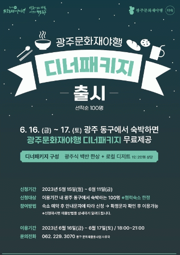 [¹Ìµð¾îÀü³² ±èÁ¤¿ì ±âÀÚ]±¤ÁÖ µ¿±¸´Â 6¿ù ¹ã°Å¸®¸¦ ¼ö³õÀ» ¡®±¤ÁÖ¹®ÈÀç¾ßÇ࡯ °³ÃÖ ±â°£ µ¿¾È(16~17ÀÏ) °ü³»¿¡¼ ¼÷¹ÚÇÏ´Â °ü±¤°´À» À§ÇÑ ¡®µð³Ê ÆÐŰÁö¡¯¸¦ Ãâ½ÃÇß´Ù°í ¹àÇû´Ù. µ¿±¸´Â ¼÷¹Ú¡¤±³Åëºñ¸¦ Áö¿øÇØÁÖ´Â ±âÁ¸ ¹æ½Ä°ú´Â ´Þ¸®¡¦