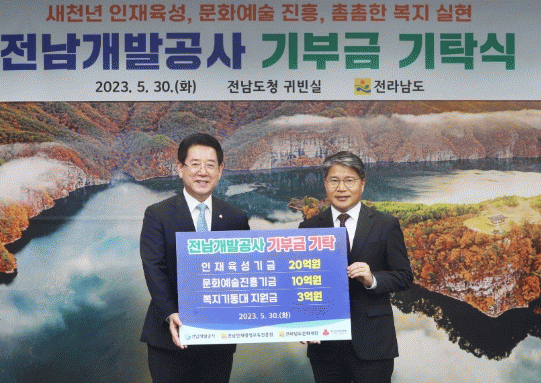 [¹Ìµð¾îÀü³² Á¦°¥´ëÁ¾ ±âÀÚ]Àü¶ó³²µµ´Â 30ÀÏ Àü³²°³¹ß°ø»ç°¡ ÀÎÀç À°¼º°ú ¹®È¿¹¼ú ¹× µµ¹Î º¹Áö ÁõÁøÀ» À§ÇØ ¼öÀÍ±Ý 33¾ï ¿øÀ» ±âºÎÇϰí Áö¿ª»çȸ °øÇå°ú »ó»ý³ª´® ½Çõ¿¡ µ¿ÂüÇß´Ù°í ¹àÇû´Ù. µµÃ» ±Íºó½Ç¿¡¼ ¿¸° ±âŹ½Ä¿¡´Â ±è¿µ·Ï¡¦