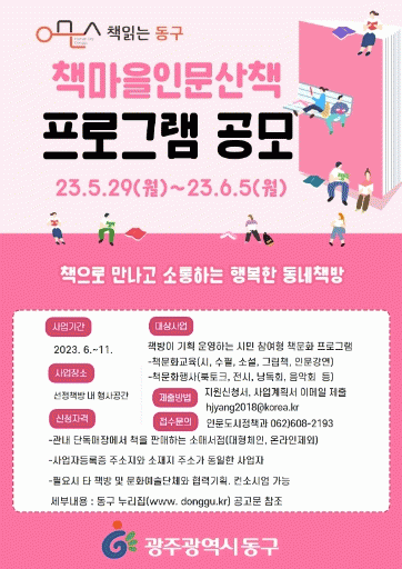 [¹Ìµð¾îÀü³² ±èÁ¤¿ì ±âÀÚ]±¤ÁÖ µ¿±¸´Â ¡®2023³â Ã¥ Àд µ¿±¸ »ç¾÷¡¯ ÀÏȯÀ¸·Î ¡®Ã¥¸¶À» Àι®»êÃ¥¡¯ ÇÁ·Î±×·¥¿¡ Âü¿©ÇÒ µ¿³× Ã¥¹æÀ» 6¿ù 5ÀϱîÁö °ø°³ ¸ðÁýÇÑ´Ù°í ¹àÇû´Ù. ¡®Ã¥¸¶À» Àι®»êÃ¥¡¯Àº µ¿³× Ã¥¹æÀÌ ±âȹ¡¤¿î¿µÇÏ´Â ½Ã¹Î Âü¿©Çü¡¦