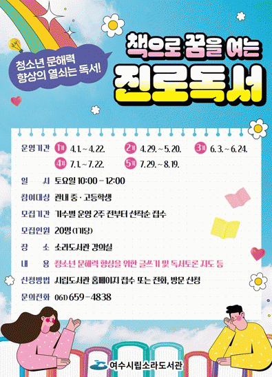[¹Ìµð¾îÀü³² ÀüÇü¼º ±âÀÚ]¿©¼ö½Ã°¡ ¿À´Â 6¿ù 2ÀϱîÁö ¡®Ã¥À¸·Î ²ÞÀ» ¿©´Â Áø·Îµ¶¼¡¯ 3±â Âü¿©ÀÚ 20¸íÀ» ¸ðÁýÇÑ´Ù. ¡®Ã¥À¸·Î ²ÞÀ» ¿©´Â Áø·Îµ¶¼¡¯´Â Áß,°íµîÇлýÀ» ´ë»óÀ¸·Î û¼Ò³â ¹®ÇØ·Â Çâ»óÀ» À§ÇÑ ±Û¾²±â ¼ö¾÷ ¹× µ¶¼ Åä·ÐÀ» Áö¡¦