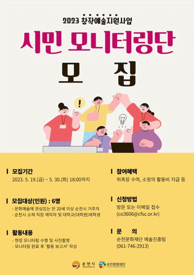 [¹Ìµð¾îÀü³² ÀÓ¼º¿Ï ±âÀÚ]¼øÃµ¹®ÈÀç´ÜÀº ¡®2023 âÀÛ¿¹¼úÁö¿ø»ç¾÷ ½Ã¹Î ¸ð´ÏÅ͸µ´Ü¡¯À» ¿À´Â 30ÀϱîÁö °ø°³ ¸ðÁýÇÑ´Ù. âÀÛ¿¹¼úÁö¿ø»ç¾÷Àº ¿¹¼úÀεéÀÇ Ã¢ÀÛȯ°æ Á¶¼º ¹× Áö¿ª °íÀ¯¼ºÀ» ´ãÀº ¹®È¿¹¼ú âÀÛȰµ¿À» Àå·ÁÇϱâ À§ÇØ Àç´Ü¿¡¼¡¦