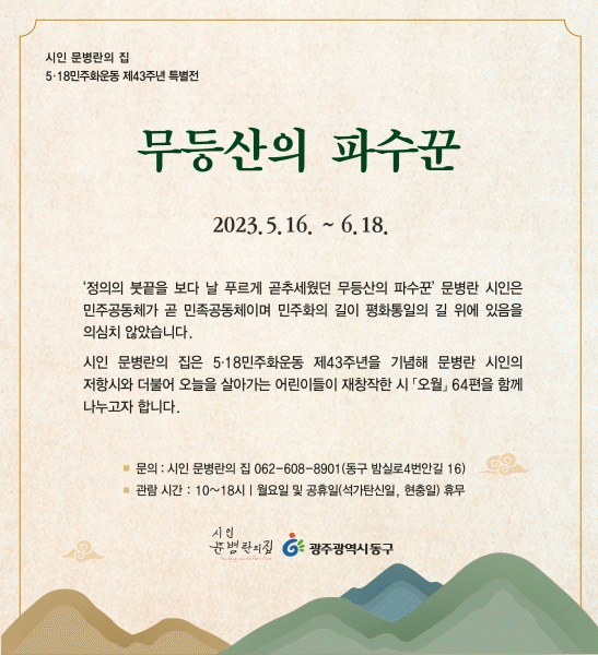 [¹Ìµð¾îÀü³² ±èÁ¤¿ì ±âÀÚ] ±¤ÁÖ µ¿±¸´Â Áö»êµ¿¿¡ °³°üÇÑ ½ÃÀÎ ¹®º´¶õÀÇ Áý¿¡¼ Á¦43ÁÖ³â 5¡¤18±¤ÁÖ¹ÎÁÖȿÀ» ±â³äÇÑ Æ¯º° Àü½Ã ¡®¹«µî»êÀÇ ÆÄ¼ö²Û¡¯À» 6¿ù 18ÀϱîÁö ÇÑ ´Þ°£ °³ÃÖÇÑ´Ù°í ¹àÇû´Ù. À̹ø Àü½Ã´Â ¡®Á¤ÀÇÀÇ º×³¡À» º¸´Ù ³¯¡¦