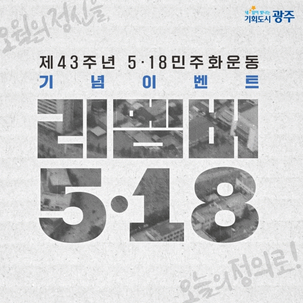 [¹Ìµð¾îÀü³² Á¦°¥´ëÁ¾ ±âÀÚ] ±¤ÁÖ±¤¿ª½Ã´Â 5¡¤18¹ÎÁÖȿ 43ÁÖ³âÀ» ¸Â¾Æ 5¡¤18À» ±â¾ïÇÏ´Â »çȸ°ü°è¸Á¼ºñ½º Ã߸𠸱·¹ÀÌ À̺¥Æ® ¡®¸®¸â¹ö 5¡¤18¡¯À» ÁøÇàÇÑ´Ù. À̺¥Æ® ¡®¸®¸â¹ö 5¡¤18¡¯Àº ¿À¿ùÁ¤½ÅÀ» ±â¾ïÇÏ°í ¹ÎÁÖȿ Èñ»ýÀÚ¸¦ Ãß¡¦