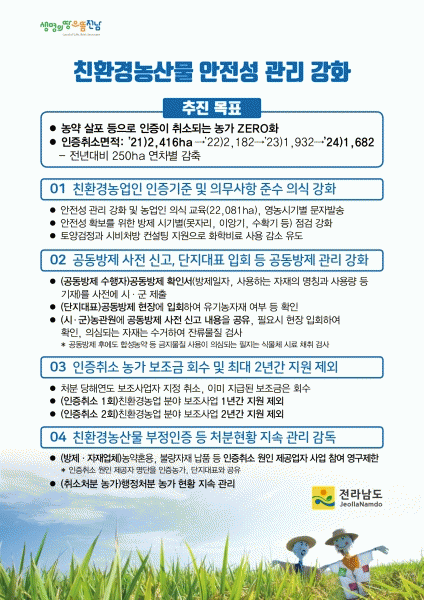 [¹Ìµð¾îÀü³² Á¦°¥´ëÁ¾ ±âÀÚ] Àü¶ó³²µµ´Â ģȯ°æ ÀÎÁõ±âÁØ Àǹ«»çÇ× ÁؼöÀÇ½Ä °È¸¦ ÅëÇÑ Ä£È¯°æ³ó¾÷ ³»½Çȸ¦ À§ÇØ ¡®Ä£È¯°æ ³ó»ê¹° ¾ÈÀü¼º °ü¸®°È ±³À°¡¯À» ¿¬Áß ÃßÁøÇÑ´Ù°í ¹àÇû´Ù. º¯°æµÈ Á¤Ã¥ ¼³¸í µî ½ÇÈ¿¼º ÀÖ´Â ÇöÀå Á᫐ ±³À°¡¦