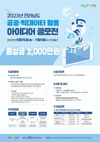[¹Ìµð¾îÀü³² Á¦°¥´ëÁ¾ ±âÀÚ] Àü¶ó³²µµ´Â °ø°ø¡¤ºòµ¥ÀÌÅ͸¦ Ȱ¿ëÇÑ Ã¢¾÷ ¾ÆÀ̵ð¾î ¹× ºñÁî´Ï½º ¸ðµ¨ ¹ß±¼¡¤À°¼ºÀ¸·Î µ¥ÀÌÅÍ ±â¹Ý ÇàÁ¤ Ȱ¼ºÈ¸¦ À§ÇÑ ¡®2023³â Àü¶ó³²µµ °ø°ø¡¤ºòµ¥ÀÌÅÍ È°¿ë ¾ÆÀ̵ð¾î °ø¸ðÀü¡¯À» °³ÃÖÇÑ´Ù°í ¹àÇû´Ù. Àü³²¡¦