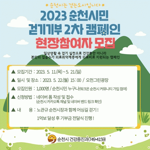 [¹Ìµð¾îÀü³² ÀÓ¼º¿Ï ±âÀÚ] ¼øÃµ½Ã´Â ¿À´Â 22ÀÏ ¿ÀÈÄ 3½Ã ¿Àõ±×¸°±¤Àå¿¡¼ °È±â ±âºÎ¸¦ ÇÒ ½Ã¹Î 1,000¸íÀ» ÃÊÃ»ÇØ ¡®1¾ï º¸ ´Þ¼º ±â³ä °È±â ±âºÎ Ä·ÆäÀΡ¯À» Àü°³ÇÑ´Ù. Çà»ç´Â ½ºÆ®·¹ÄªÇϱâ, ¾î½Ì±æ ÇÔ²² °È±â, 1¾ï º¸ ´Þ¼º °Ç°È¸º¹ Ãࡦ