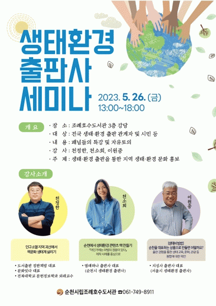 [¹Ìµð¾îÀü³² ÀÓ¼º¿Ï ±âÀÚ] ¼øÃµ½Ã´Â Àü±¹ »ýÅ¡¤È¯°æ ÃâÆÇ»ç °ü°èÀÚ¿Í ½Ã¹ÎÀ» ´ë»óÀ¸·Î ¡®»ýÅ¡¤È¯°æ ÃâÆÇ»ç ¼¼¹Ì³ª¡¯¸¦ ¿À´Â 26ÀÏ ¿ÀÈÄ 1½Ã ¼øÃµ½Ã¸³Á¶·ÊÈ£¼öµµ¼°ü °´ç¿¡¼ °³ÃÖÇÑ´Ù°í ¹àÇû´Ù. ¡®»ýÅ¡¤È¯°æ ÃâÆÇÀ» ÅëÇÑ Áö¿ª »ýÅ ¹®¡¦
