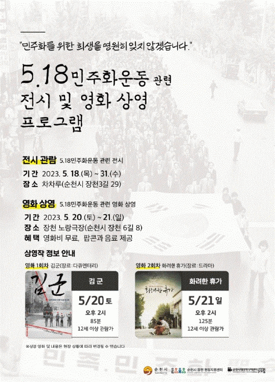 [¹Ìµð¾îÀü³² ÀÓ¼º¿Ï ±âÀÚ] ¼øÃµ½Ã´Â Á¾ÇÕ¹ö½ºÅ͹̳ΠÀÏ¿ø µµ½ÃÀç»ý »ç¾÷±¸¿ª ³» Á¶¼ºµÈ °ÅÁ¡½Ã¼³ÀÎ Àåõ ³ë¶û±ØÀå°ú Â÷Â÷·ç Ȱ¼ºÈ¸¦ À§ÇØ Áö¿ª ¿ª»ç ÀÚ¿ø°ú ¿¬°èÇÑ 5¡¤18 ¹ÎÁÖȿ °ü·Ã Àü½Ã ¹× ¿µÈ »ó¿µ ÇÁ·Î±×·¥À» ¿î¿µÇÑ´Ù°í ¹àÇû¡¦