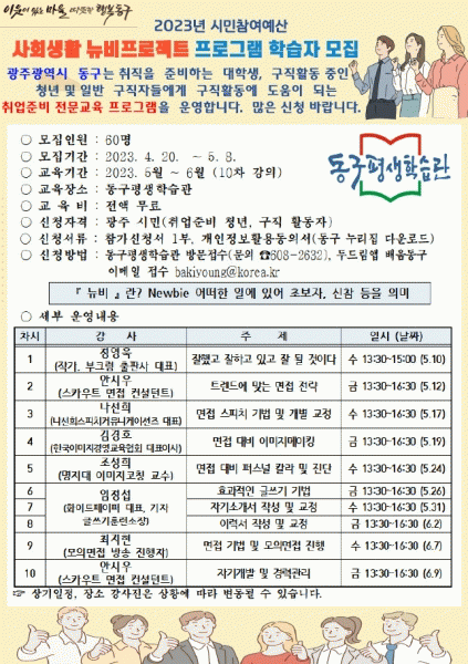 [¹Ìµð¾îÀü³² ±èÁ¤¿ì ±âÀÚ] ±¤ÁÖ µ¿±¸´Â û³â¡¤ÀϹÝÀÎ ±¸Á÷ÀÚ, Ãë¾÷ Áغñ ´ëÇлýÀ» ´ë»óÀ¸·Î Ãë¾÷ ´ëºñ Àü¹®±³À° ÇÁ·Î±×·¥ ¡®»çȸ»ýȰ ´ººñ ÇÁ·ÎÁ§Æ®¡¯¸¦ ¿î¿µÇÑ´Ù°í ¹àÇû´Ù. ¡®»çȸ»ýȰ ´ººñ ÇÁ·ÎÁ§Æ®¡¯´Â ±¤ÁÖ±¤¿ª½Ã ½Ã¹ÎÂü¿©¿¹»ê»ç¾÷ ¡¦