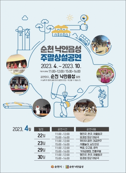 [¹Ìµð¾îÀü³² ÀÓ¼º¿Ï ±âÀÚ] ¼øÃµ ³«¾ÈÀ¾¼º¿¡¼´Â 4¿ùºÎÅÍ 10¿ù±îÁö ¸ÅÁÖ Åä¿äÀϰú ÀÏ¿äÀÏ ¿ÀÀü 11½Ã¿Í ¿ÀÈÄ 3½Ã °¢°¢ ÇÑ ½Ã°£¾¿ ÁÖ¸»»ó¼³°ø¿¬ÀÌ ¿¸°´Ù. °ø¿¬ °ü¶÷Àº ¹«·áÀÌ¸ç ±¹¾Ç, ÆÇ¼Ò¸®, ÀüÅ빫¿ë µî ÀüÅ뿹¼ú°ú Çö´ë¿¹¼úÀÌ ¾î¿ì·¯Áø¡¦
