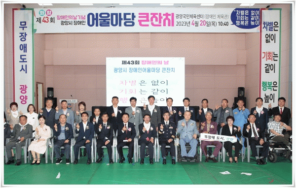 [¹Ìµð¾îÀü³² ÀÓ¼º¿Ï ±âÀÚ] ±¤¾ç½Ã´Â 20ÀÏ ±¹¹ÎüÀ°¼¾ÅÍ¿¡¼ ¡®Â÷º°Àº ¾øÀÌ, ±âȸ´Â °°ÀÌ, ÇູÀº ³ôÀÌ¡¯¸¦ ½½·Î°ÇÀ¸·Î ¡®Á¦43ȸ Àå¾ÖÀÎÀÇ ³¯¡¯ ±â³äÇà»ç¸¦ °³ÃÖÇß´Ù°í ¹àÇû´ÙÀü³²ÁöüÀå¾ÖÀÎÇùȸ ±¤¾ç½ÃÁöȸ°¡ ÁÖ°üÇÑ ¡®Àå¾ÖÀÎÀÇ ³¯¡¯ ±â³ä¡¦