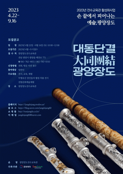 [¹Ìµð¾îÀü³² ÀÓ¼º¿Ï ±âÀÚ] ±¤¾ç½Ã´Â ¹®ÈÀçû °ø¸ð»ç¾÷ÀÎ 2023³â Àü¼ö±³À°°ü Ȱ¼ºÈ »ç¾÷ ¡®¼Õ³¡¿¡¼ ÇǾ´Â ¿¹¼ú, ±¤¾çÀåµµ¡¯¸¦ ¿À´Â 22ÀϺÎÅÍ ÀåµµÀü¼ö±³À°°ü¿¡¼ ½Ç½ÃÇÑ´Ù°í ¹àÇû´Ù. Àü¼ö±³À°°ü Ȱ¼ºÈ »ç¾÷Àº Àåµµ °íÀ¯ ±â¼úÀ» º¸¡¦