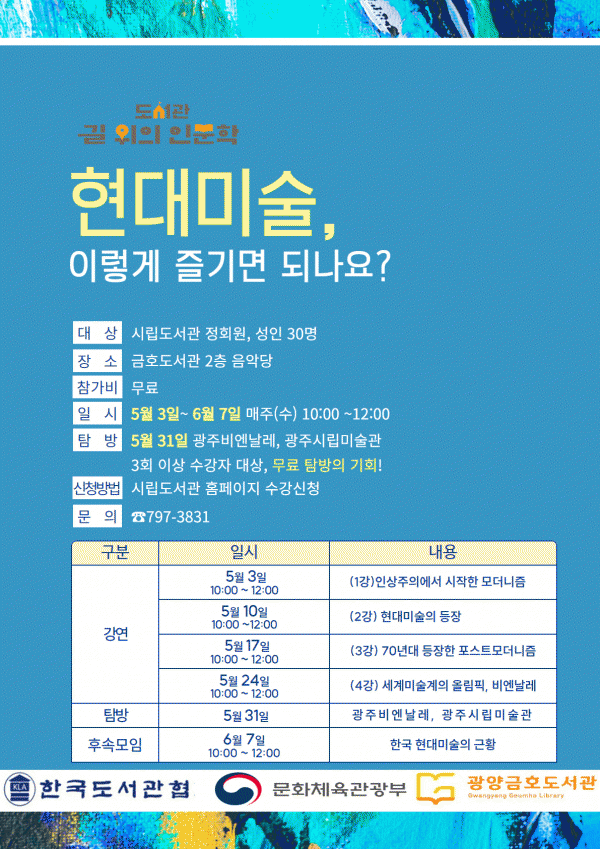 [¹Ìµð¾îÀü³² ÀÓ¼º¿Ï ±âÀÚ] ±¤¾ç±ÝÈ£µµ¼°üÀÌ ¿À´Â 5¿ù 3ÀϺÎÅÍ ¡®Çö´ë¹Ì¼ú, ÀÌ·¸°Ô Áñ±â¸é µÇ³ª¿ä?¡¯¶ó´Â ÁÖÁ¦·Î ¹®ÈüÀ°°ü±¤ºÎ °ø¸ð»ç¾÷ÀÎ ¡®2023 µµ¼°ü ±æ À§ÀÇ Àι®ÇÐ ÇÁ·Î±×·¥¡¯À» ¿î¿µÇÑ´Ù. ±æ À§ÀÇ Àι®ÇÐ ÇÁ·Î±×·¥Àº ¿À´Â 5¿ù ¡¦