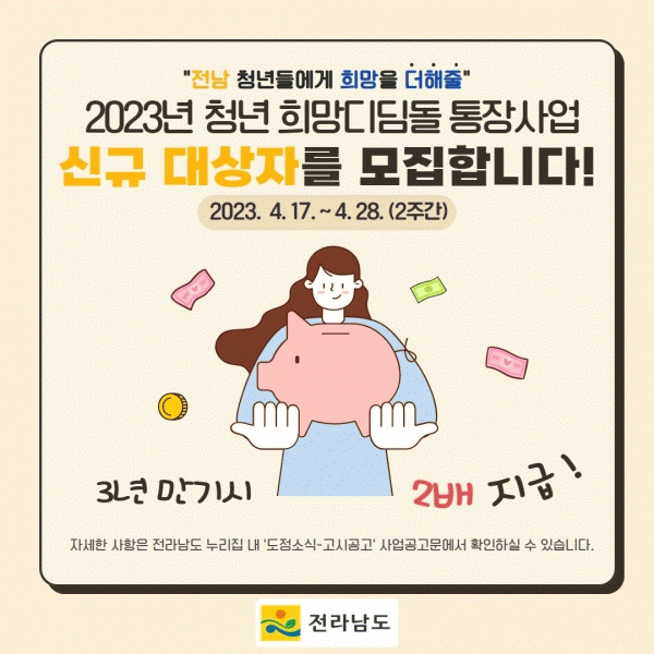 [¹Ìµð¾îÀü³² ÀÓ¼º¿Ï ±âÀÚ] ¼øÃµ½Ã´Â 2023³â ¡®Ã»³â Èñ¸Á µðµõµ¹ ÅëÀå»ç¾÷¡¯ ´ë»óÀÚ¸¦ ¿À´Â 28ÀϱîÁö ¸ðÁýÇÑ´Ù°í ¹àÇû´Ù. û³â Èñ¸Á µðµõµ¹ ÅëÀå»ç¾÷Àº û³âµéÀÌ 36°³¿ù µ¿¾È ¿ù 10¸¸¿øÀ» Àû¸³ÇÏ¸é ½Ã¿¡¼ °°Àº ±Ý¾×À» ¸ÅĪ Àû¸³ÇØÁÖ´Â »ç¡¦