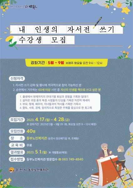 [¹Ìµð¾îÀü³² ÀÓ¼º¿Ï ±âÀÚ] ¼øÃµ½Ã µ¿ºÎ³ëÀκ¹Áö°ü¿¡¼´Â 60¼¼ ÀÌ»ó ½Ã¹ÎµéÀ» ´ë»óÀ¸·Î ¡®³» ÀλýÀÇ ÀÚ¼Àü ¾²±â¡¯ÇÁ·Î±×·¥À» ¿î¿µÇÑ´Ù. ¡®³» ÀλýÀÇ ÀÚ¼Àü ¾²±â¡¯ÇÁ·Î±×·¥À» ÅëÇØ ¾î¸£½ÅµéÀÌ Áö±Ý±îÁö »ì¾Æ ¿Â ÀλýÀ» µÇµ¹¾Æº¸°í Á¦2ÀÇ¡¦