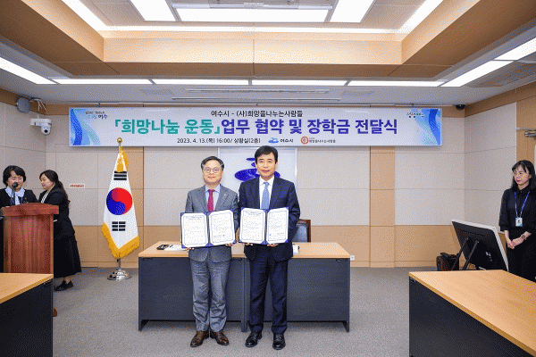 [¹Ìµð¾îÀü³² ÀüÇü¼º ±âÀÚ] ¿©¼ö½Ã´Â Áö³ 13ÀÏ ½Ãû »óȲ½Ç¿¡¼ Èñ¸ÁÀ»³ª´©´Â»ç¶÷µé°ú ¡®Èñ¸Á³ª´®¿îµ¿¡¯ ÈÄ¿øÇù¾àÀ» ü°áÇß´Ù. À̹ø Çù¾àÀº ¡®µû¶æÇÑ µ¿Çà, ¾Æ¸§´Ù¿î ³ª´®¡¯À» ÁÖÁ¦·Î ¿©¼öÁö¿ª Àú¼Òµæ°¡±¸ ÇлýÀ» À§ÇÑ ÀåÇÐ±Ý ¹× ÄÄÇ»ÅÍ¡¦