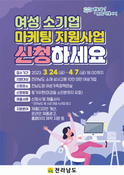 [¹Ìµð¾îÀü³² Á¦°¥´ëÁ¾ ±âÀÚ] Àü¶ó³²µµ´Â ¿©¼º ¼Ò±â¾÷ÀÇ °æÀï·ÂÀ» °ÈÇØ ±â¾÷ Ȱµ¿À» ÃËÁøÇÏ°í ¼ÒµæÀ» Áõ´ëÇϱâ À§ÇÑ ¡®2023³â ¿©¼º ¼Ò±â¾÷ ¸¶ÄÉÆÃ Áö¿ø»ç¾÷¡¯ Âü¿© ±â¾÷À» ¸ðÁýÇÑ´Ù°í ¹àÇû´Ù. ½Åû ÀÚ°ÝÀº ¸ðÁý °ø°íÀÏ ÇöÀç Àü³²¿¡ Àִ¡¦