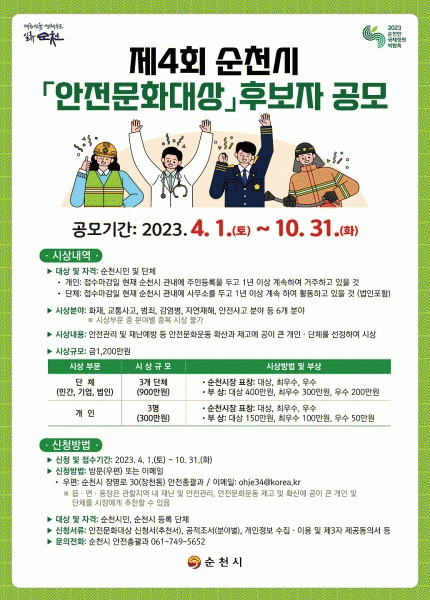 [¹Ìµð¾îÀü³² ÀÓ¼º¿Ï ±âÀÚ] ¼øÃµ½Ã´Â ü°èÀû À§±â´ëÀÀ ´É·ÂÀ» °®Ãß°í °¢Á¾ Àç³À¸·ÎºÎÅÍ ¾ÈÀü¿¡ Èû¾´ À¯°øÀÚ¸¦ ¹ß±¼ÇØ ½Ã»óÇϴ¡®Á¦4ȸ ¼øÃµ½Ã ¾ÈÀü¹®È´ë»ó¡¯Èĺ¸ÀÚ¸¦ °ø¸ðÇÑ´Ù. ¼øÃµ½Ã ¾ÈÀü¹®È´ë»óÀº Àç³ ¿¹¹æ¡¤´ëºñ¡¤´ëÀÀ¡¤º¹±¸ µî ¡¦