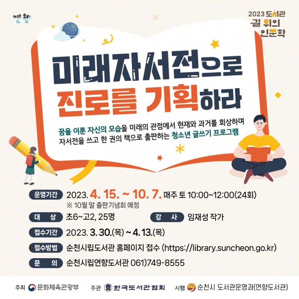 [¹Ìµð¾îÀü³² ÀÓ¼º¿Ï ±âÀÚ] ¼øÃµ½Ã°¡ û¼Ò³âµéÀ» ´ë»óÀ¸·Î¡®¹Ì·¡ÀÚ¼ÀüÀ¸·Î Áø·Î¸¦ ±âȹÇ϶󡯴 ±æ À§ÀÇ Àι®ÇРå¾²±â ÇÁ·Î±×·¥À» ¿î¿µÇÑ´Ù. ÇÁ·Î±×·¥Àº 4¿ù 15ÀϺÎÅÍ 10¿ù 7ÀϱîÁö ¸ÅÁÖ Åä¿äÀÏ 10½Ã¿¡ ¼øÃµ½Ã¸³¿¬Çâµµ¼°ü¿¡¼ 24ȸ¿¡ ¡¦