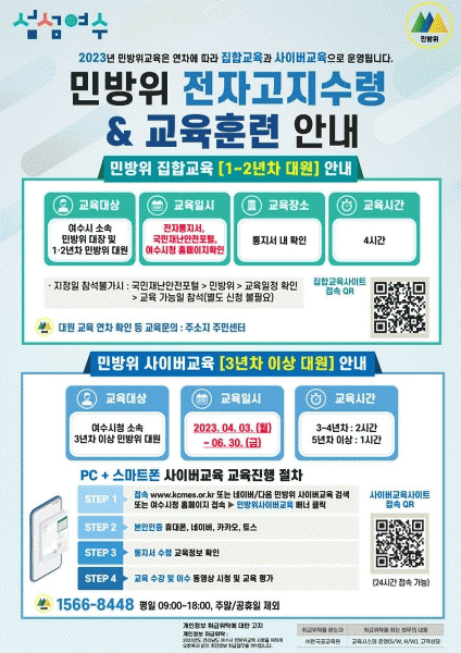 [¹Ìµð¾îÀü³² ÀüÇü¼º ±âÀÚ] ¿©¼ö½Ã°¡ ¿ÃÇØ ±âÁØ 3³â Â÷ ÀÌ»ó Áö¿ª¹Î¹æÀ§´ë¿ø 1¸¸2000¿©¸íÀ» ´ë»óÀ¸·Î ¹Î¹æÀ§ »çÀ̹ö±³À°À» ½Ç½ÃÇÑ´Ù. ±³À°±â°£Àº ¿À´Â 4¿ù 3ÀϺÎÅÍ 6¿ù 30ÀϱîÁö´Ù. ±³À°¹æ¹ýÀº ¿©¼ö½Ãû ȨÆäÀÌÁö¿¡ ÀÖ´Â ¹è³Ê QR½ºÄµ ¡¦
