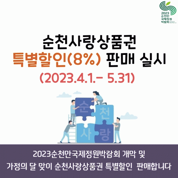 [¹Ìµð¾îÀü³² ÀÓ¼º¿Ï ±âÀÚ] ¼øÃµ½Ã°¡ 4¿ù 1ÀϺÎÅÍ 5¿ù ¸»±îÁö 2°³¿ù°£ 2023¼øÃµ¸¸±¹Á¦Á¤¿ø¹Ú¶÷ȸ °³¸·°ú 5¿ù °¡Á¤ÀÇ ´ÞÀ» ¸Â¾Æ ¼øÃµ»ç¶û»óǰ±Ç Ưº°ÇÒÀÎ ÆÇ¸Å¸¦ ½Ç½ÃÇÑ´Ù. ½Ã´Â Áö³ 2¿ù ¼øÃµ»ç¶û»óǰ±Ç ¹ßÇà¿¡ µû¸¥ ±¹ºñ Áö¿ø ºñÀ²ÀÌ È®¡¦