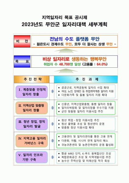 [¹Ìµð¾îÀü³² ±èÆÇ±¹ ±âÀÚ] Àü³² ¹«¾È±ºÀº °í¿ë·ü 64%, Ãë¾÷ÀÚ ¼ö 48,700¸í, °ø°ø¡¤¹Î°£ ºÎ¹® ÀÏÀÚ¸® 11,035°³ ´Þ¼ºÀ» ¸ñÇ¥·Î ÇÏ´Â Áö¿ªÀÏÀÚ¸® ¸ñÇ¥ °ø½ÃÁ¦ 2023³âµµ ÀÏÀÚ¸® ´ëÃ¥ ¿¬Â÷º° ¼¼ºÎ °èȹÀ» °ø½ÃÇß´Ù. Áö¿ªÀÏÀÚ¸® ¸ñÇ¥ °ø½ÃÁ¦´Â¡¦