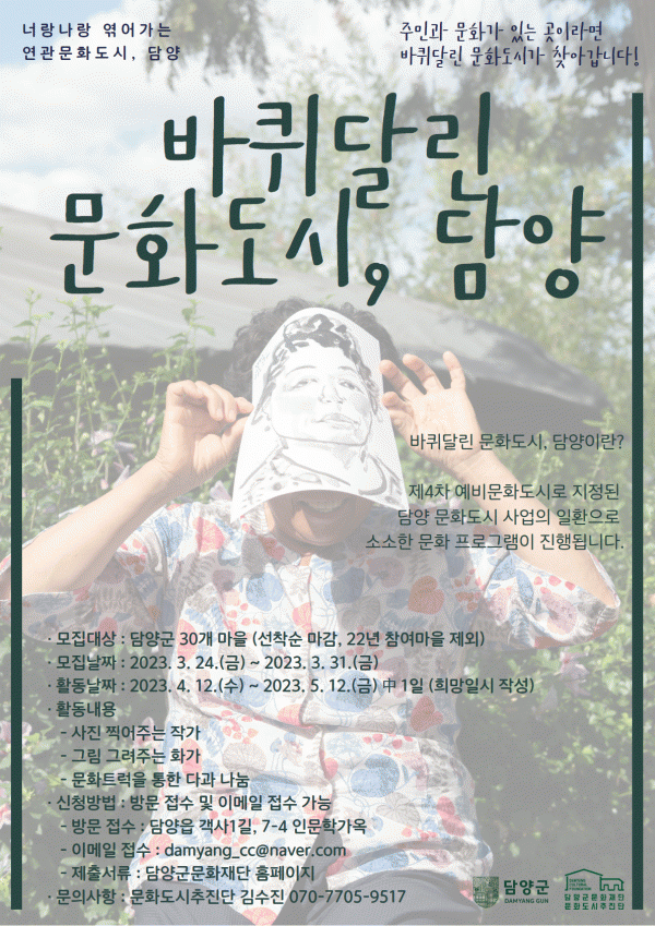 [¹Ìµð¾îÀü³² Á¦°¥´ëÁ¾ ±âÀÚ] ´ã¾ç±º¹®ÈÀç´ÜÀÌ ¿À´Â 3¿ù 31ÀϱîÁö ´ã¾ç ¹®Èµµ½ÃÀÇ Ã£¾Æ°¡´Â ÇöÀåÇü ÇÁ·ÎÁ§Æ® ¡®¹ÙÄû´Þ¸° ¹®Èµµ½Ã, ´ã¾ç¡¯ Âü¿© ¸¶À»À» ¸ðÁýÇÑ´Ù. ¡®¹ÙÄû´Þ¸° ¹®Èµµ½Ã, ´ã¾ç¡¯Àº ¡®³Ê¶û³ª¶û ¿«¾î°¡´Â ¿¬°ü¹®Èµµ½Ã¡¯¸¦¡¦