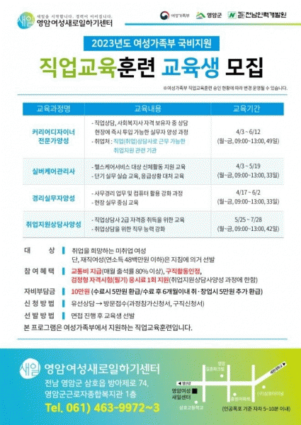 [¹Ìµð¾îÀü³² Á¦°¥´ëÁ¾ ±âÀÚ] ¿µ¾Ï±º ¿µ¾Ï¿©¼º»õ·ÎÀÏÇϱ⼾ÅÍ¿¡¼´Â Ãë¾÷ Èñ¸Á ¿©¼ºÀ» ´ë»óÀ¸·Î 2023³â Á÷¾÷±³À°ÈƷûýÀ» °úÁ¤º° ¼±Âø ¸ðÁýÇÑ´Ù°í ¹àÇû´Ù. ¿ÃÇØ Á÷¾÷±³À°ÈÆ·ÃÀº Ä¿¸®¾îµðÀÚÀ̳ÊÀü¹®°¡¾ç¼º ½Ç¹öÄɾî°ü¸®»ç °æ¸®½Ç¹«Àھ缺 ¡¦