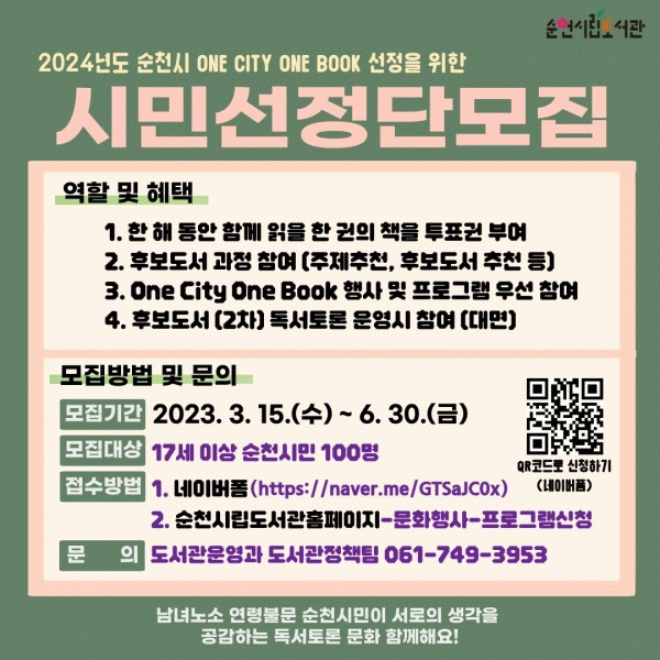 [¹Ìµð¾îÀü³² ÀÓ¼º¿Ï ±âÀÚ] ¼øÃµ½Ã°¡ ³»³âµµ One City One Book ¼±Á¤À» À§ÇØ ¡®½Ã¹Î¼±Á¤´Ü¡¯100¸íÀ» 6¿ù ¸»±îÁö ¸ðÁýÇÑ´Ù. ¿ÃÇØ·Î 20³â°¸¦ ¸Â´Â One City One BookÀº ½Ã¹ÎµéÀÌ ÇÑ ±ÇÀÇ Ã¥À» Àаí ÇÔ²² Åä·ÐÇÏ´Â ¹®È¸¦ ¸¸µé¾î °¡°í ÀÖ´Ù¡¦