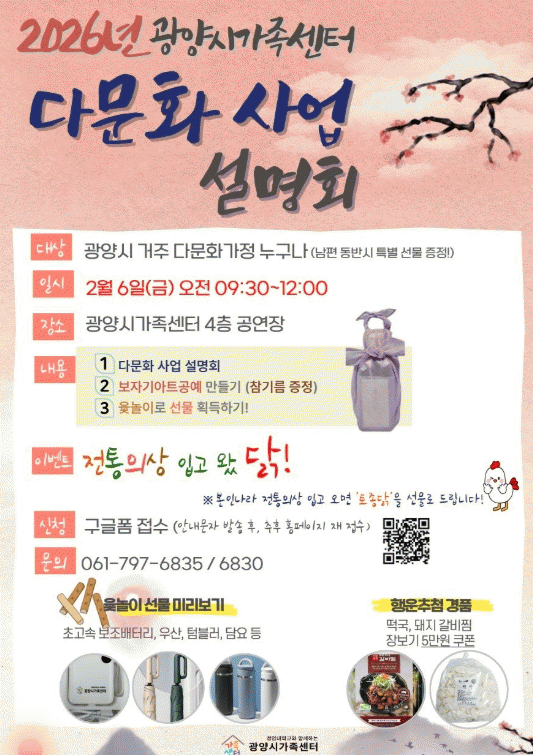 [¹Ìµð¾îÀü³² ÀÓ¼º¿Ï ±âÀÚ]±¤¾ç½Ã°¡Á·¼¾ÅÍ´Â 2026³â¿¡ ½ÃÇàÇÏ´Â ´Ù¹®È°¡Á· Áö¿ø»ç¾÷¿¡ ´ëÇÑ ÀÌÇØ¸¦ µ½±â À§ÇØ ¿À´Â 2¿ù 6ÀÏ ¿ÀÀü 9½Ã 30ºÐ, ±¤¾ç½Ã °¡Á·¹®È¼¾ÅÍ 4Ãþ °¡Á·°ø¿¬Àå¿¡¼ ¡®2026³â ´Ù¹®È»ç¾÷ ¼³¸íȸ¡¯¸¦ °³ÃÖÇÑ´Ù°í ¹àÇû´Ù. ¡¦