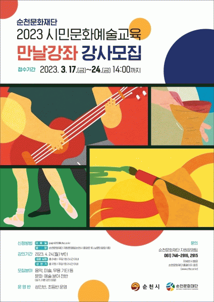 [¹Ìµð¾îÀü³² ÀÓ¼º¿Ï ±âÀÚ] ¼øÃµ¹®ÈÀç´ÜÀÌ 2023 ½Ã¹Î¹®È¿¹¼ú±³À° ¡®¸¸³¯°Á¡¯°»ç¸¦ ¿À´Â 17ÀϺÎÅÍ 24ÀϱîÁö ¸ðÁýÇÑ´Ù. ¸ðÁýÀº ¼ºÀιݰú Ãʵî¹ÝÀ» ¿î¿µÇÒ °»ç 13¸íÀÌ´Ù. Áö¿ø ÀÚ°ÝÀº °ø°íÀÏ ÇöÀç ¸¸ 20¼¼ ÀÌ»ó °ü·ÃÇаú Àü°ø Á¹¾÷ ÈÄ¡¦