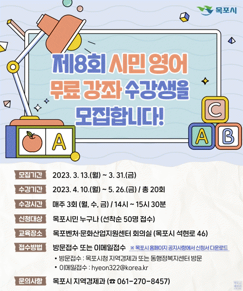 [¹Ìµð¾îÀü³² °í±Ô¼® ±âÀÚ] ¸ñÆ÷½Ã°¡ ¿À´ÃºÎÅÍ 3¿ù 31ÀϱîÁö ½Ã¹Î ¿µ¾î °Á ¼ö°»ýÀ» ¸ðÁýÇÑ´Ù. À̹ø °Á´ ¿À´Â 4¿ù 10ÀϺÎÅÍ 5¿ù 26ÀϱîÁö ÁÖ3ȸ ÃÑ 20ȸ¿¡ °ÉÃÄ ÁøÇàµÇ¸ç °»çÀÇ Áöµµ ¾Æ·¡ ¿µ¾î ±âÃÊ ¹ßÀ½°ú »óȲº° È¸È µîÀ» ´Ù·ç°Ô¡¦