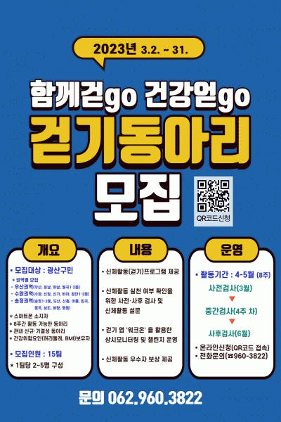 [¹Ìµð¾îÀü³² ±èÁ¤¿ì ±âÀÚ] ±¤ÁÖ ±¤»ê±¸´Â ±¤»ê±¸¹ÎÀ» ´ë»óÀ¸·Î °È±â µ¿¾Æ¸®¸¦ ¸ðÁý, °Ç°»ýȰ ½ÇõÀ» Áö¿øÇÑ´Ù°í ¹àÇû´Ù. 2~5ÀÎÀ¸·Î ÀÌ·ïÁø ½Å±Ô ¶Ç´Â ±â °á¼º µ¿¾Æ¸®´Â ¹°·Ð °È±â ½Çõ¿¡ µµÀüÇÏ°í ½ÍÀº °³Àεµ Âü¿©ÇÒ ¼ö ÀÖ´Ù. ½ÅûÀº¡¦