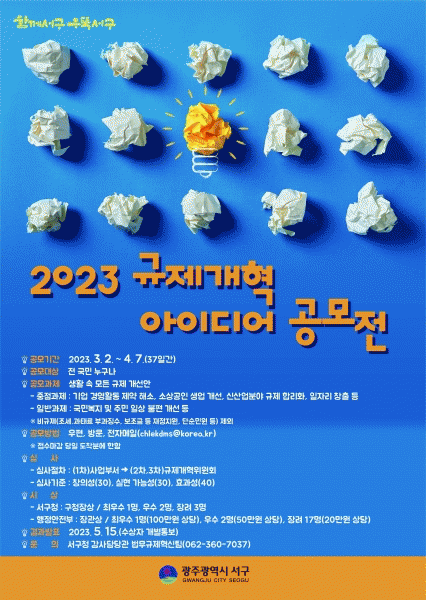 [¹Ìµð¾îÀü³² ±èÁ¤¿ì ±âÀÚ] âÀÇÀûÀÎ ¾ÆÀ̵ð¾î ¹ß±¼·Î ÇàÁ¤Çõ½ÅÀ» À̲ø¾î³½ ±¤ÁÖ ¼±¸°¡ ºÒÇÕ¸®ÇÑ ±ÔÁ¦ ¹ß±¼ ¹× °³¼±À¸·Î Áö¿ª°æÁ¦ Ȱ¼ºÈ¸¦ ²ÒÇϱâ À§ÇØ ¡®2023³â ±ÔÁ¦°³Çõ ¾ÆÀ̵ð¾î °ø¸ðÀü¡¯À» °³ÃÖÇÑ´Ù. ¼±¸´Â 4¿ù7ÀϱîÁö ÇàÁ¤¾ÈÀüºÎ¡¦