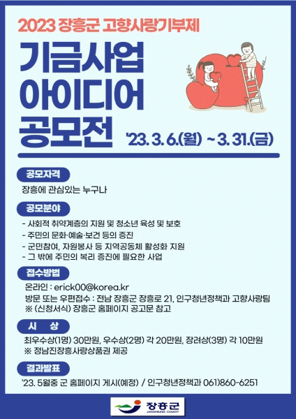 [¹Ìµð¾îÀü³² Á¦°¥´ëÁ¾ ±âÀÚ] ÀåÈﱺÀº 2024³â¿¡ ÃßÁøÇÒ °íÇâ»ç¶û±âºÎÁ¦ ±â±Ý»ç¾÷ ¾ÆÀ̵ð¾î¸¦ 3¿ù 31ÀϱîÁö °ø¸ðÇÑ´Ù°í ¹àÇû´Ù. 2023³â 1¿ù 1ÀϺÎÅÍ ½ÃÇàÁßÀÎ °íÇâ»ç¶û±âºÎÁ¦´Â ¿ÃÇØ ¸ð¾ÆÁø ±âºÎ±ÝÀ¸·Î 2024³âµµºÎÅÍ ±â±Ý»ç¾÷À» ÃßÁøÇÒ ¡¦