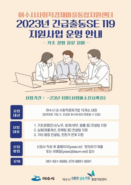 [¹Ìµð¾îÀü³² ÀüÇü¼º ±âÀÚ] ¿©¼ö½Ã°¡ »çȸÀû°æÁ¦±â¾÷ÀÇ °æÀï·Â °È¸¦ À§ÇÑ ¡®¸ÂÃãÇü ÄÁ¼³ÆÃ¡¯À» Áö¿øÇÑ´Ù. ½Ã¿¡ µû¸£¸é ¡®±ä±ÞÃ⵿ SE 119¡¯Àº »çȸÀû°æÁ¦±â¾÷¿¡ ºÐ¾ßº° °æ¿µÄÁ¼³ÆÃ Àü¹®°¡¸¦ 1:1 ¸ÅĪ ÇØ ±â¾÷ÀÇ °æ¿µ ¾Ö·Î»çÇ×À» ÇØ°áÇØ¡¦