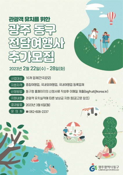 [¹Ìµð¾îÀü³² ±èÁ¤¿ì ±âÀÚ] ±¤ÁÖ µ¿±¸´Â ´Üü °ü±¤°´ À¯Ä¡¸¦ À§ÇØ ±¹³»¡¤¿Ü °ü±¤»óǰ °³¹ß°ú È«º¸¸¶ÄÉÆÃ ¿î¿µ¿¡ ¿ª·® ÀÖ´Â ¡®2023³â µ¿±¸ Àü´ã¿©Çà»ç¡¯¸¦ ¿À´Â 28ÀϱîÁö Ãß°¡ ¸ðÁýÇÑ´Ù°í ¹àÇû´Ù. µ¿±¸´Â Áö³ 2³â°£ 28°³ Àü´ã¿©Çà»ç¸¦ ¿î¡¦