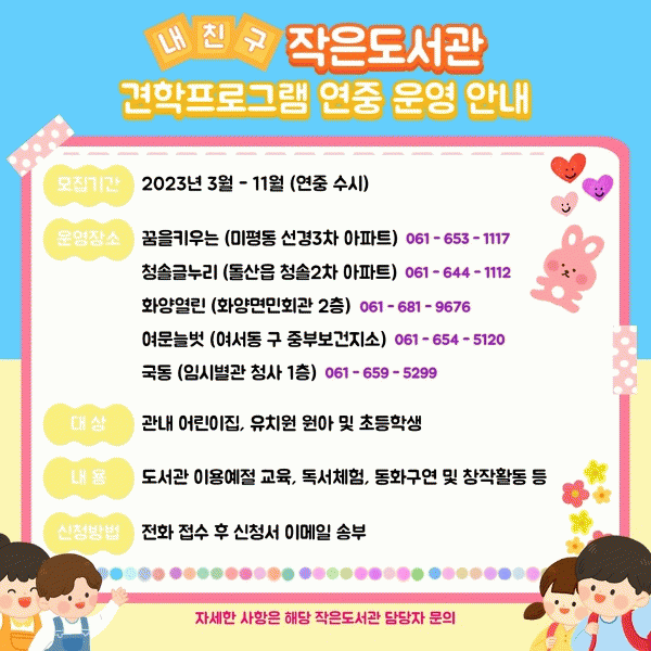 [¹Ìµð¾îÀü³² ÀüÇü¼º ±âÀÚ] ¿©¼ö½Ã°¡ ¾ÆÀ̵éÀÌ Ã¥¿¡ ´ëÇÑ Èï¹Ì¸¦ °®°í µ¶¼È¯°æ¿¡ Àͼ÷ÇØÁú ¼ö ÀÖµµ·Ï °ø¸³ ÀÛÀºµµ¼°ü °ßÇÐÇÁ·Î±×·¥ ¡®³» Ä£±¸ ÀÛÀºµµ¼°ü¡¯À» ¿î¿µÇÑ´Ù. °ßÇÐÇÁ·Î±×·¥Àº ¿À´Â 3¿ùºÎÅÍ 11¿ù±îÁö °ø¸³ ÀÛÀºµµ¼°ü 5°÷¿¡¼¡¦