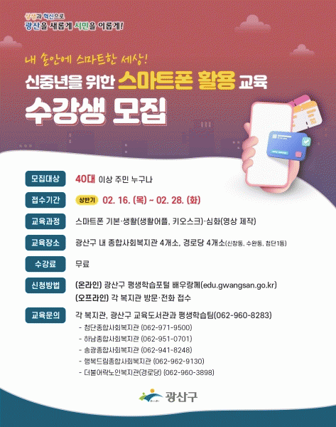 [¹Ìµð¾îÀü³² ±èÁ¤¿ì ±âÀÚ] ±¤ÁÖ ±¤»ê±¸´Â 40´ë ÀÌ»ó ½Ã¹ÎÀ» ´ë»óÀ¸·Î ¡®µðÁöÅÐ ¸®ÅÍ·¯½Ã ±³À°¡¯ ¼ö°»ýÀ» ¸ðÁýÇÑ´Ù°í ¹àÇû´Ù. ÁßÀ塤³ë³âÃþÀÇ µðÁöÅÐ ¿ª·®À» ³ôÀ̵µ·Ï Áö¿øÇÏ´Â ¡®½ÅÁ߳⠵ðÁöÅÐ Æò»ý±³À°¡¯ »ç¾÷ÀÇ ÀÏȯÀÌ´Ù. ±³À°Àº ½º¡¦