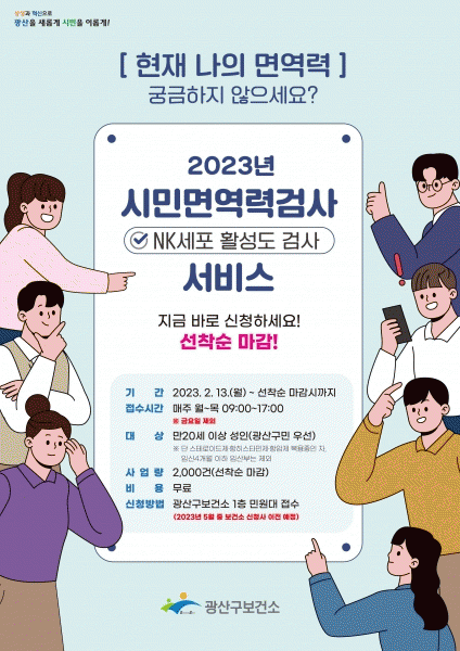 [¹Ìµð¾îÀü³² ±èÁ¤¿ì ±âÀÚ] ±¤ÁÖ ±¤»ê±¸´Â 13ÀϺÎÅÍ ½Ã¹ÎÀ» ´ë»óÀ¸·Î ¸é¿ª·Â °Ë»çÀÎ NK ¼¼Æ÷ Ȱ¼ºµµ °Ë»ç¸¦ ¹«·á·Î ½ÃÇàÇÑ´Ù°í ¹àÇû´Ù. ¸é¿ª·Â NK¼¼Æ÷ Ȱ¼ºµµ °Ë»ç´Â ¿ì¸® ¸öÀÇ Àüü ¸é¿ª¿¡ Áß¿äÇÑ ¿ªÇÒÀ» ÇÏ´Â NK¼¼Æ÷ ´É·ÂÀ» ÃøÁ¤ÇÏ´Â °Ë¡¦