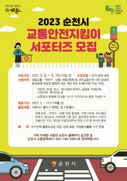 [¹Ìµð¾îÀü³² ÀÓ¼º¿Ï ±âÀÚ] ¼øÃµ½Ã´Â ¿À´Â 15ÀϱîÁö 2023¼øÃµ¸¸±¹Á¦Á¤¿ø¹Ú¶÷ȸ ¼º°ø°³ÃÖ¿Í ¼±Áø ±³Åë¾ÈÀü¹®È È®»êÀ» À§ÇØ ¡®±³Åë¾ÈÀüÁöÅ´ÀÌ ¼Æ÷ÅÍÁ¸¦ ¸ðÁýÇÑ´Ù. ±³Åë¾ÈÀüÁöÅ´ÀÌ ¼Æ÷ÅÍÁî´Â 2¿ùºÎÅÍ 12¿ù±îÁö 11°³¿ù°£ Ȱµ¿ÇÑ´Ù. Â÷¡¦